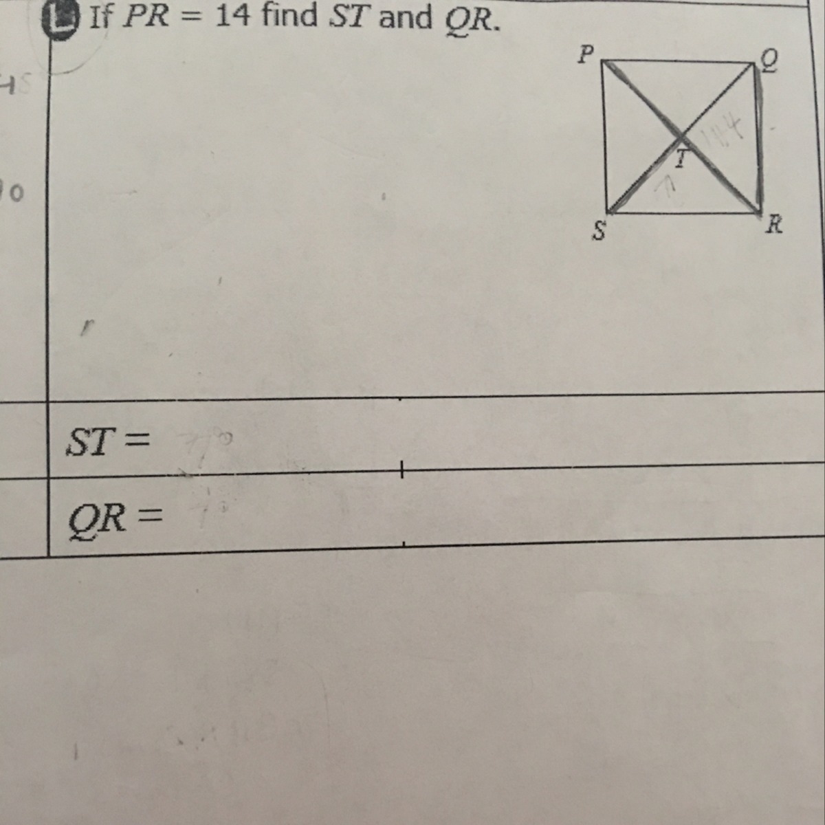 <em>As we know the diagonals bisect each other, the measure of ST would be 14 / 2 </em>