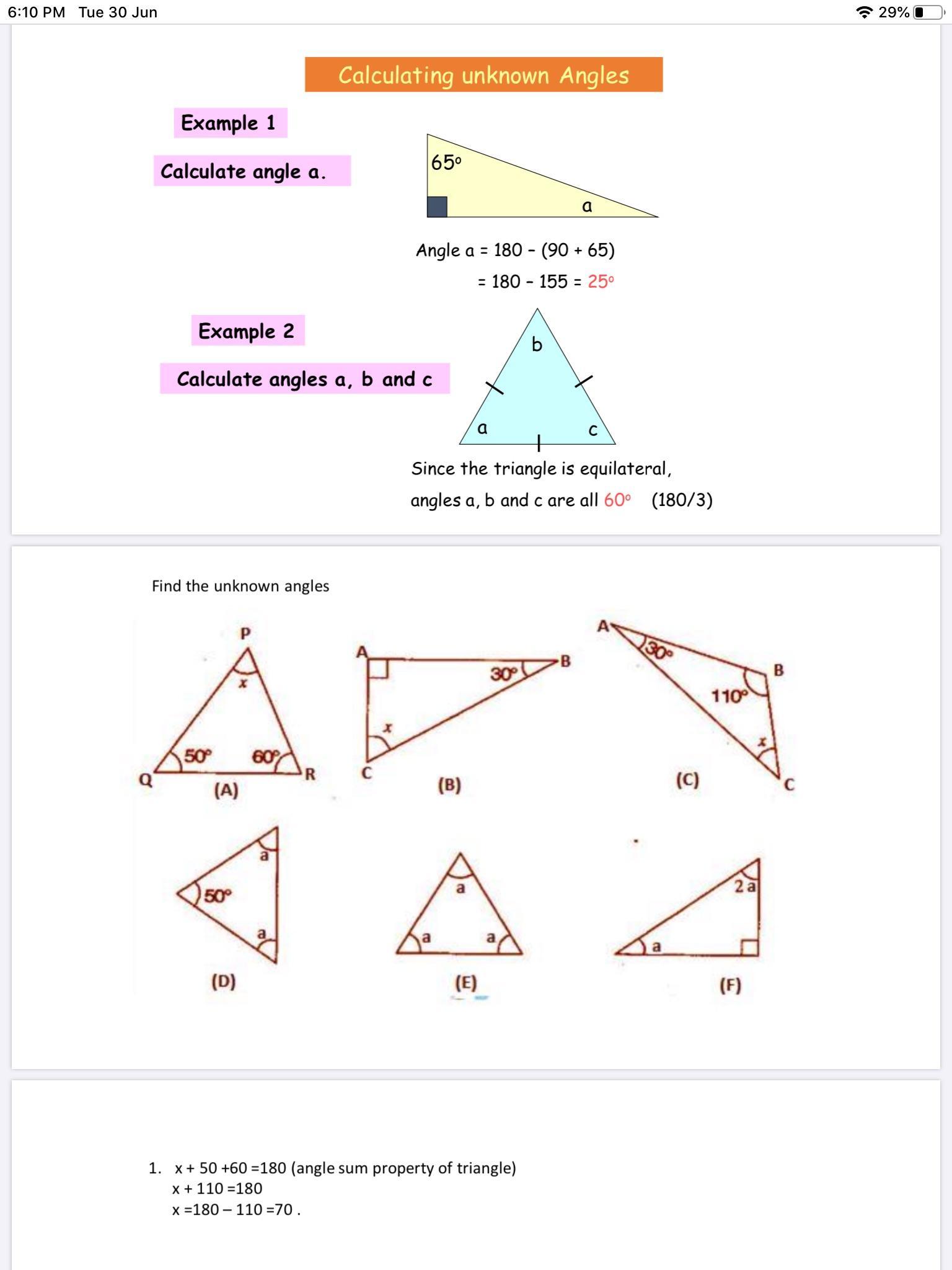 To find the missing angle you will have to use the angles that are provided for you so if there is a square in any of the corners that automatically equals 90 degrees, once you add that with the other number degrees just subtract their sum from 180 degrees. BUT if that is not the case and i only gives you on angle that you will just need to use critical thinking to see what is left in the equation and see how it plays out with the angle given and the other angle that you need to find to see if it gives you 180 degrees.