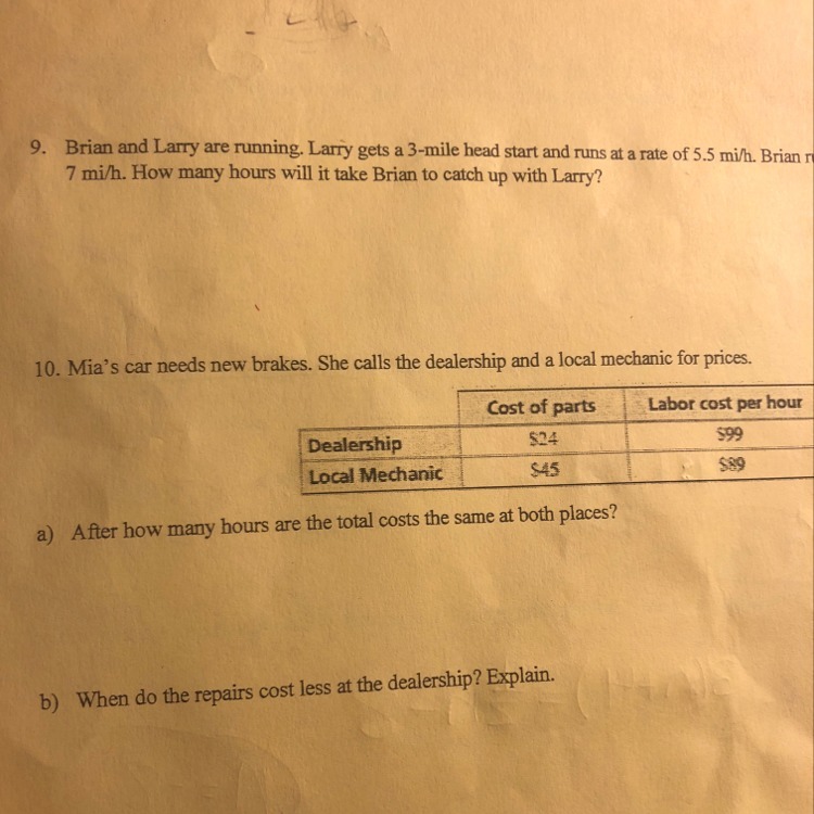 Let h = number of hours. The total cost of the repair at the dealer and at the local mechanic is calculated the same way. It is the price of the parts plus the cost of labor. The cost of labor is the number of hours multiplied by the labor cost per hour.