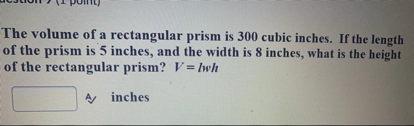The volume of a regtabgular prism is 300 cubic inches.if the length of the prism is 5 inches,and the width 8 inches what is the