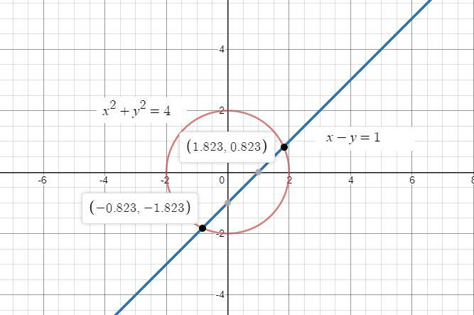 On a coordinate plane, a graph of a circle and a straight line are shown. The circle has a center at (0, 0) and a radius of 4 units. The line has a positive slope and goes through (negative 3, negative 4), (0, negative 1), and (1, 0).