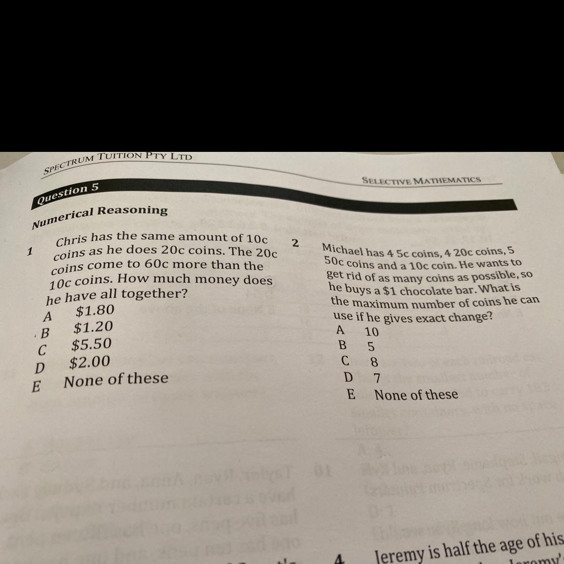 1. So Chris has 10c coins and 20c coins and they're the same amount, I'll ignore the c for the calculations but keep in mind that these are cents.