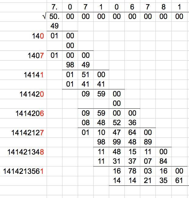 The attached picture shows the calculation of the first several digits of the square root of 50.
