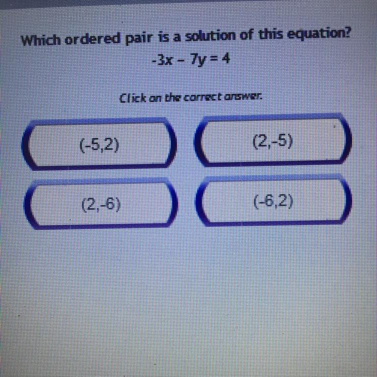 Which order pair is a solution of this equation? -3x-7y=4