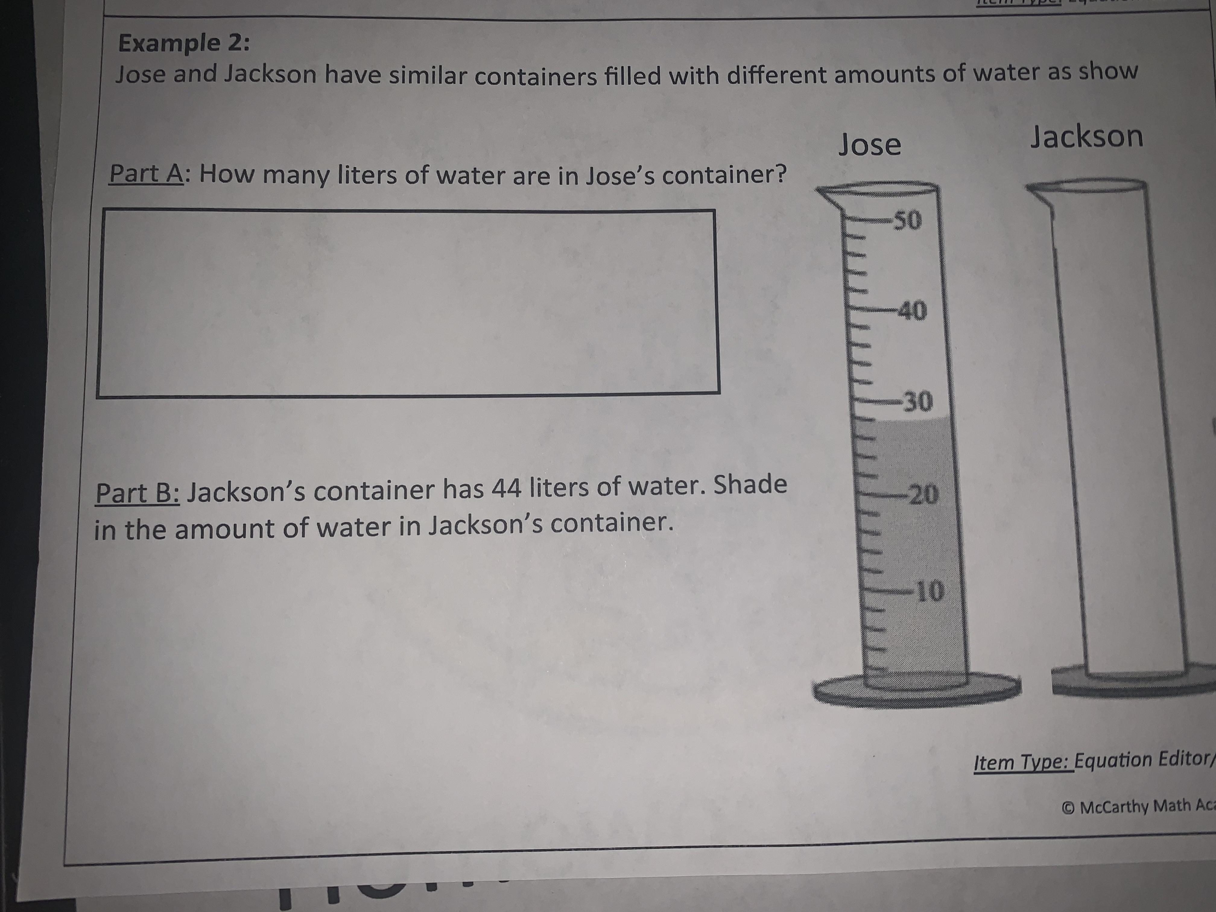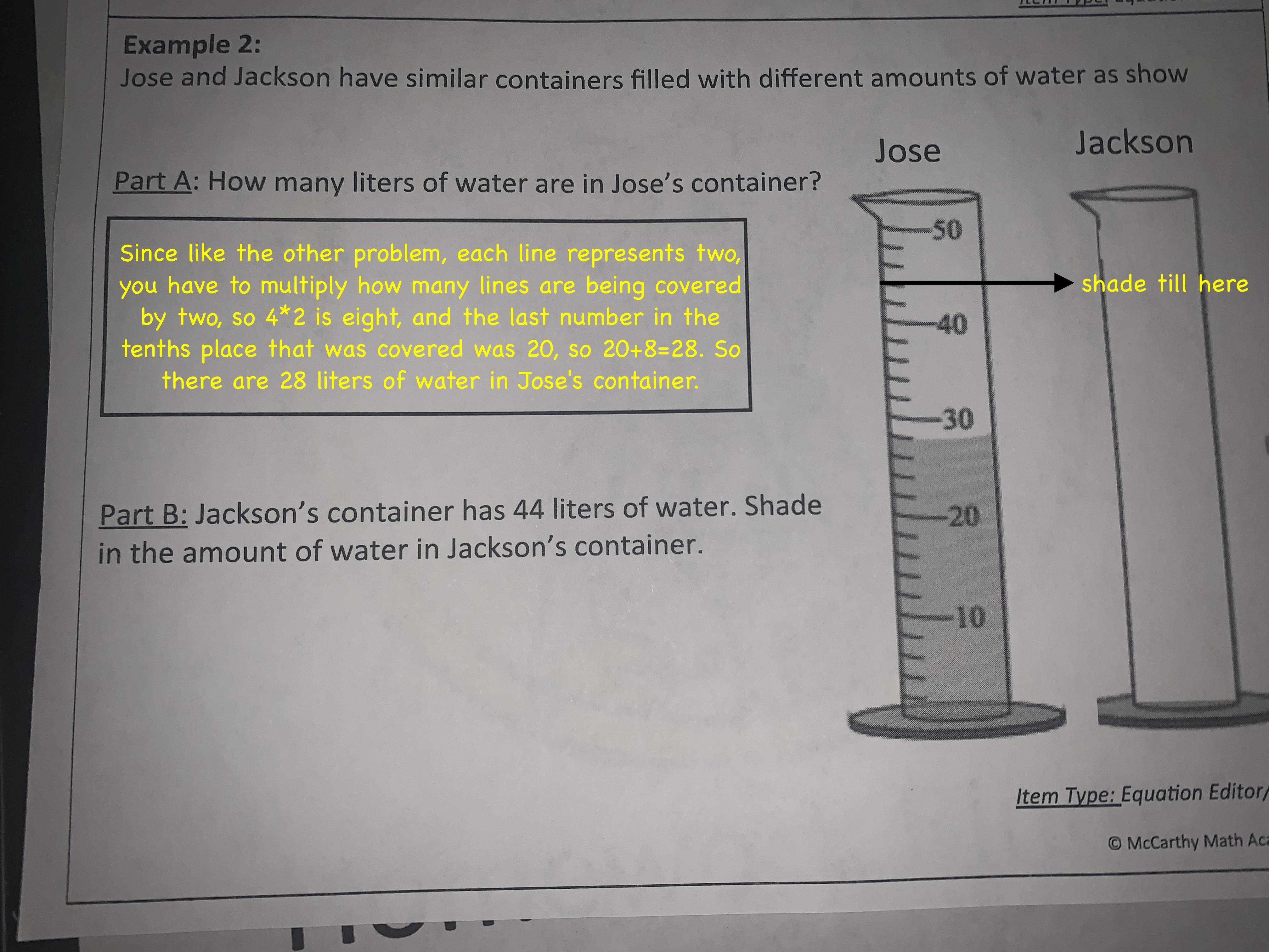 Since like the other problem, each line represents two, you have to multiply how many lines are being covered by two, so 4*2 is eight, and the last number in the tenths place that was covered was 20, so 20+8=28. So there are 28 liters of water in Jose's container.