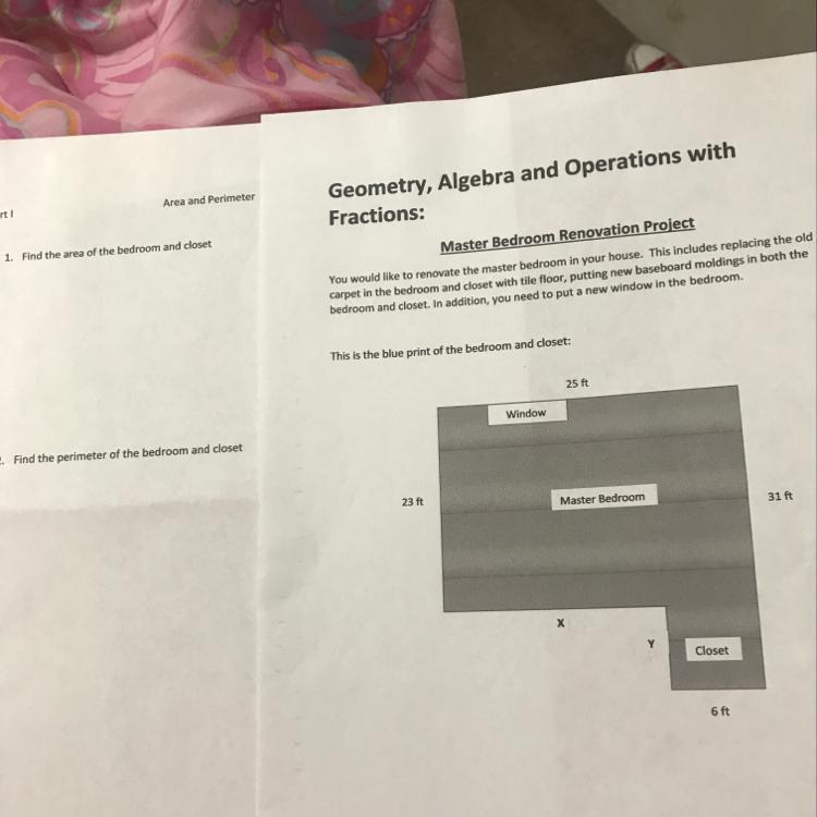 Please help me figure out the area and perimeter of the bedroom and closet. The questions are in the pictures.