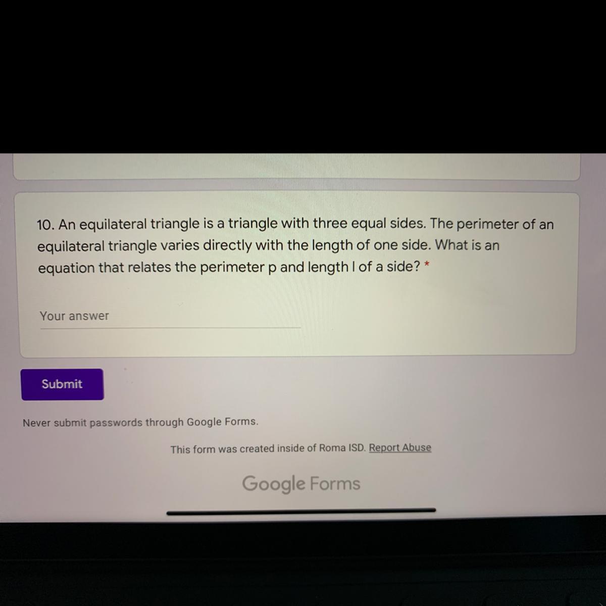 An equilateral triangle is a triangle with three equal sides. The perimeter of an equilateral triangle varies directly with the length of one side. What is an equation that relates the perimeter p and length of a side?