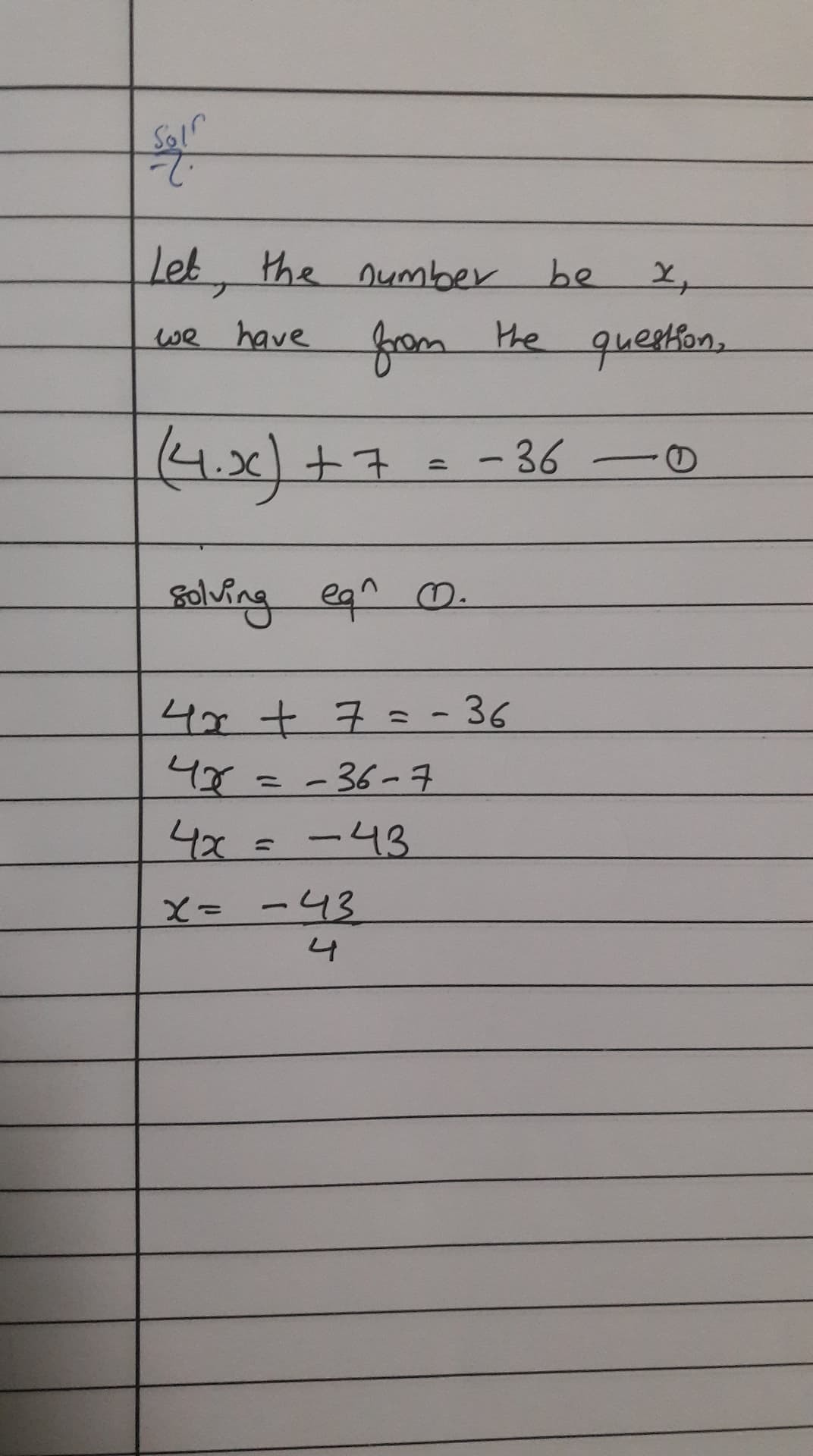 English) (the product of a number and 9), (increased by 4), (is 58) Math) (Number x 4), (+ 7), (= -36) I put in the () to show you what parts go togetherCall the Number N, we can use anything (x,s, ...) but N makes sense (N x 4) + 7 = -36 Can you do the rest? subtract 7 from both sides, divide both sides my 4, there is the answer