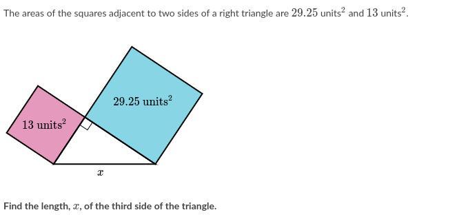 You should first find the side length of each square, and then use the Pythagorean theorem to find x.