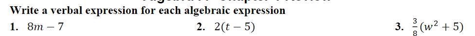 Answer: The answers are: the difference of 8 times a number m and 7, two times the difference of a number t and 5, and three eighths times the sum of w to the second power and 5.