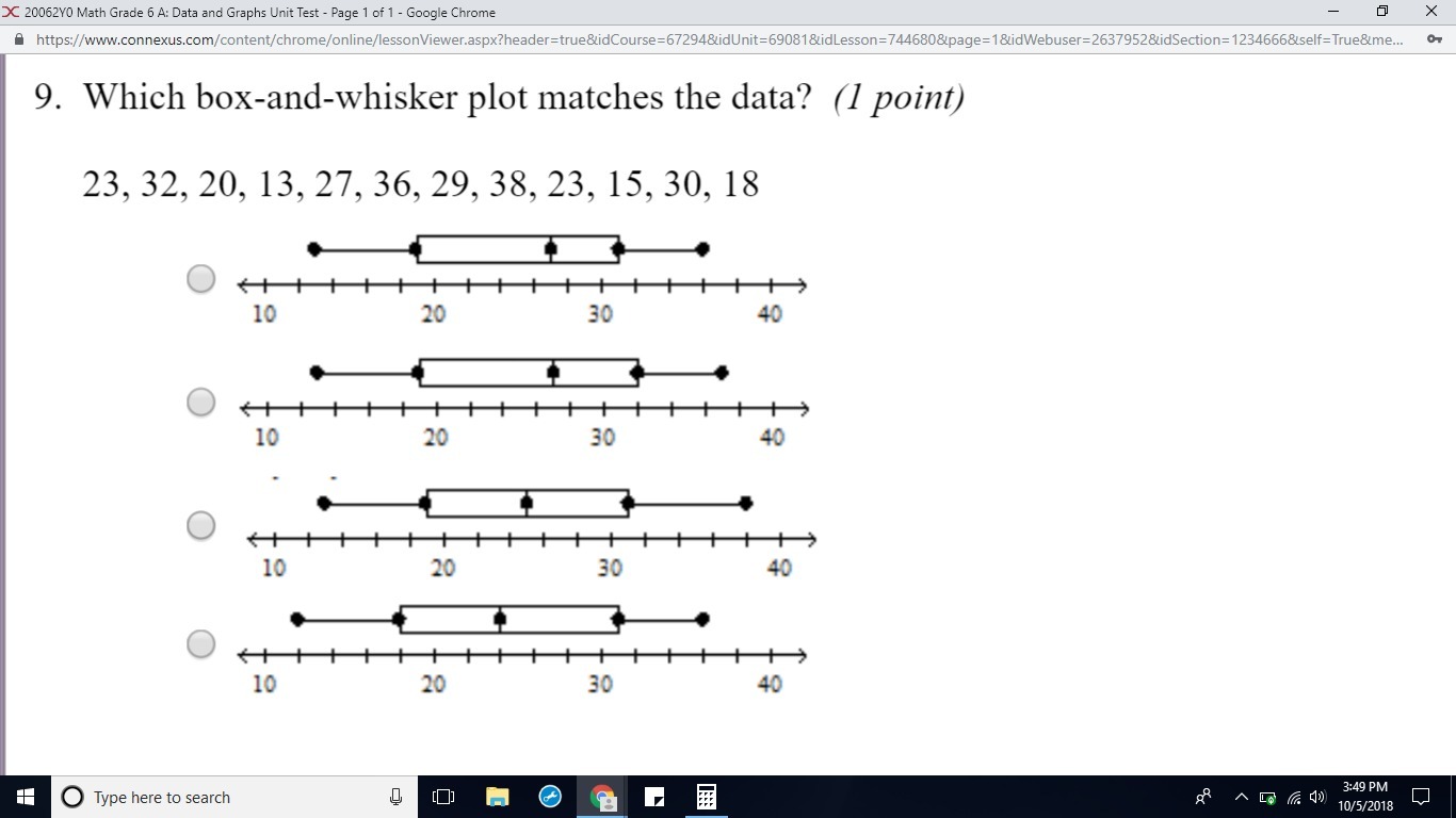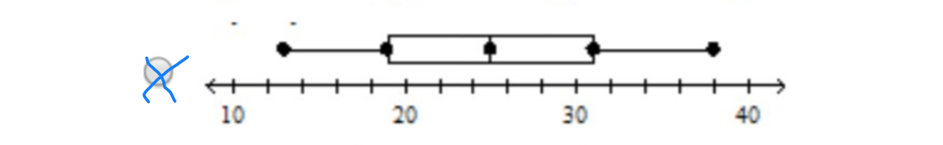 The extreme values are 13 and 38. Only the third plot has the ends of the whiskers on these values.