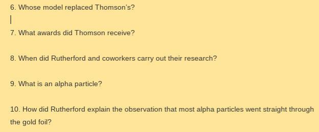 5. Rutherford explianed that most alpha particles went straight through the foil by saying that it happended because is the atom is mostly and epty space. He said that a small number of alpha particles was being deflected at large angles and that there is a concentration of positive charge in the atom.