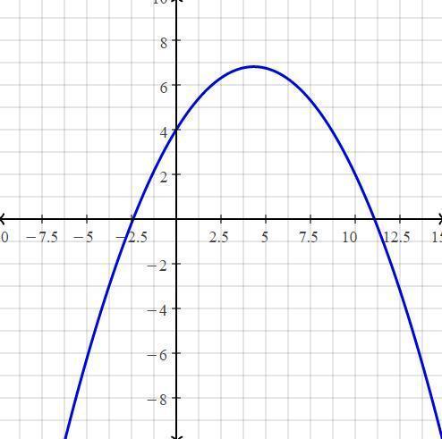 he path of her best throw. The path of this throw was represented by the quadratic equation y = –0.15x2 + 1.3x + 4, where x represents the number of feet the ball traveled and y represents the height of the ball in feet. Use the graphing calculator to graph the equation. At what distance did the ball hit the ground? Round your answer to the nearest hundredth.