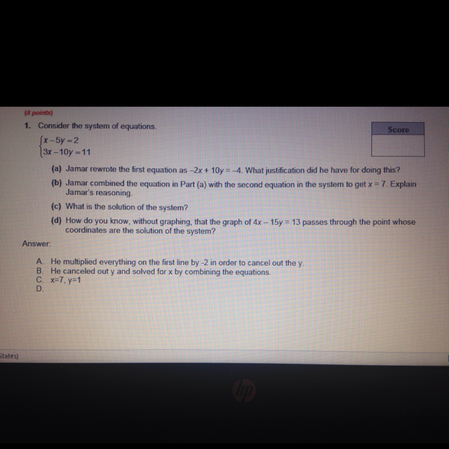 So, using the x and y values you found in C: 4(7) - 15(1) = 13 28 - 15 = 13 13 = 13 The coordinate point does fall on the graph