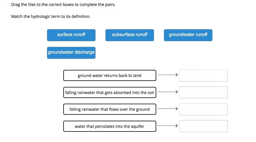<h3>Answer:</h3><h3>A. Ground Water return back to land -> Groundwater runoff</h3><h3>B. Falling rainwater that gets absorbed -> Subsurface runoff</h3><h3>C. Falling Rainwater that flows over the ground -> Surface Runoff</h3><h3>D. Water that percolates into the aquifer -> Ground water discharge</h3><h2>Explanation:</h2>