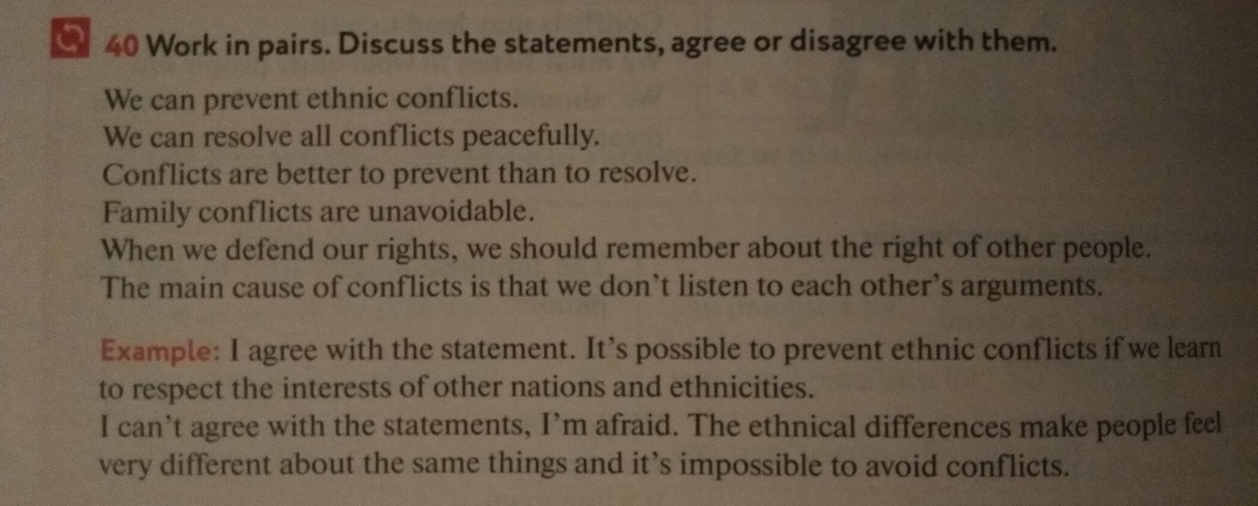 I agree with this statement. In most cases, we cannot avoid conflicts because we are not capable of listening to each other's arguments and we often hear what best suits us. We should learn how to listen to each other and how to respect our interlocutors, in order to resolve our conflicts peacefully and successfully.