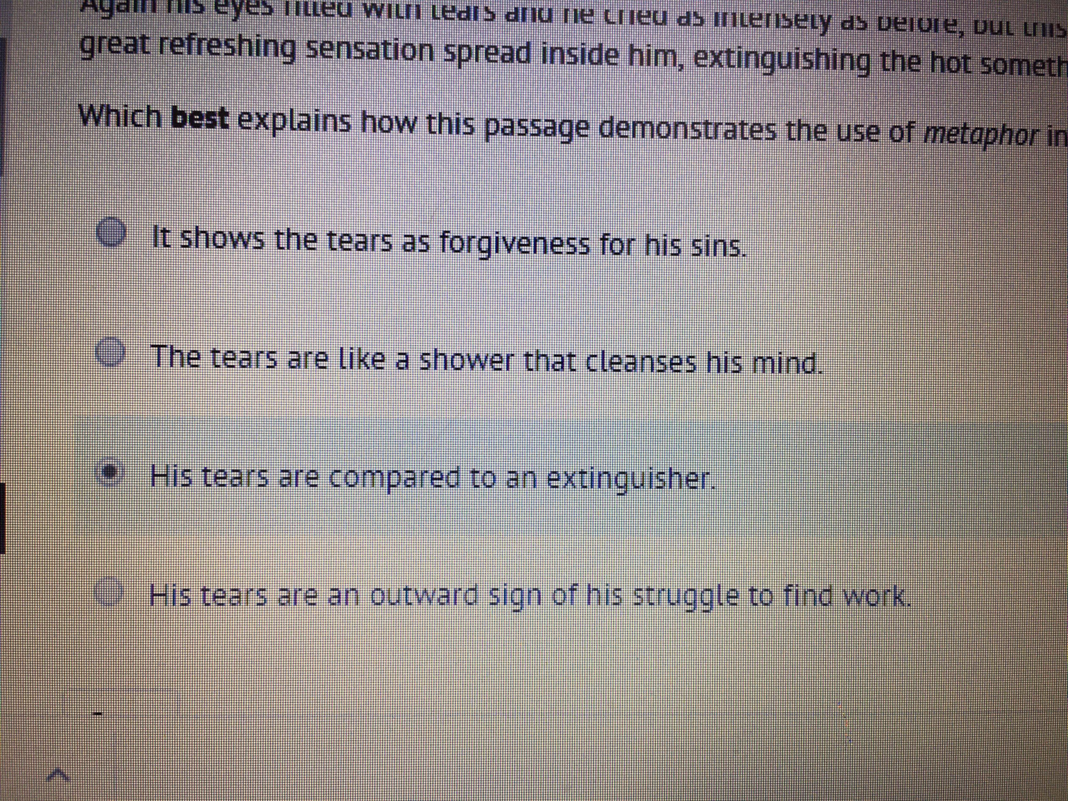 efreshing sensation spread inside him, extinguishing the hot something that had nearly strangled him. which best explains how this passage determines the use of metaphor in the story?
