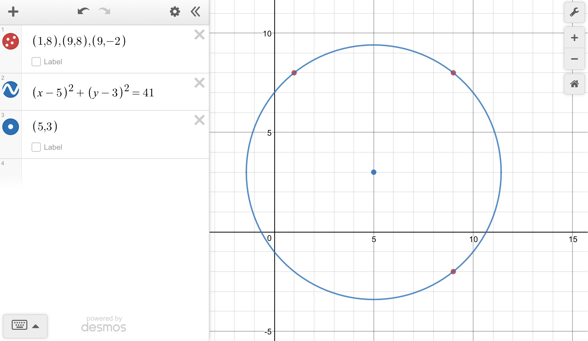 The given coordinates define a right triangle with (9, 8) as the vertex where the right angle is located. Then the other two coordinates define a diameter of the circumcircle. Its midpoint is the center.