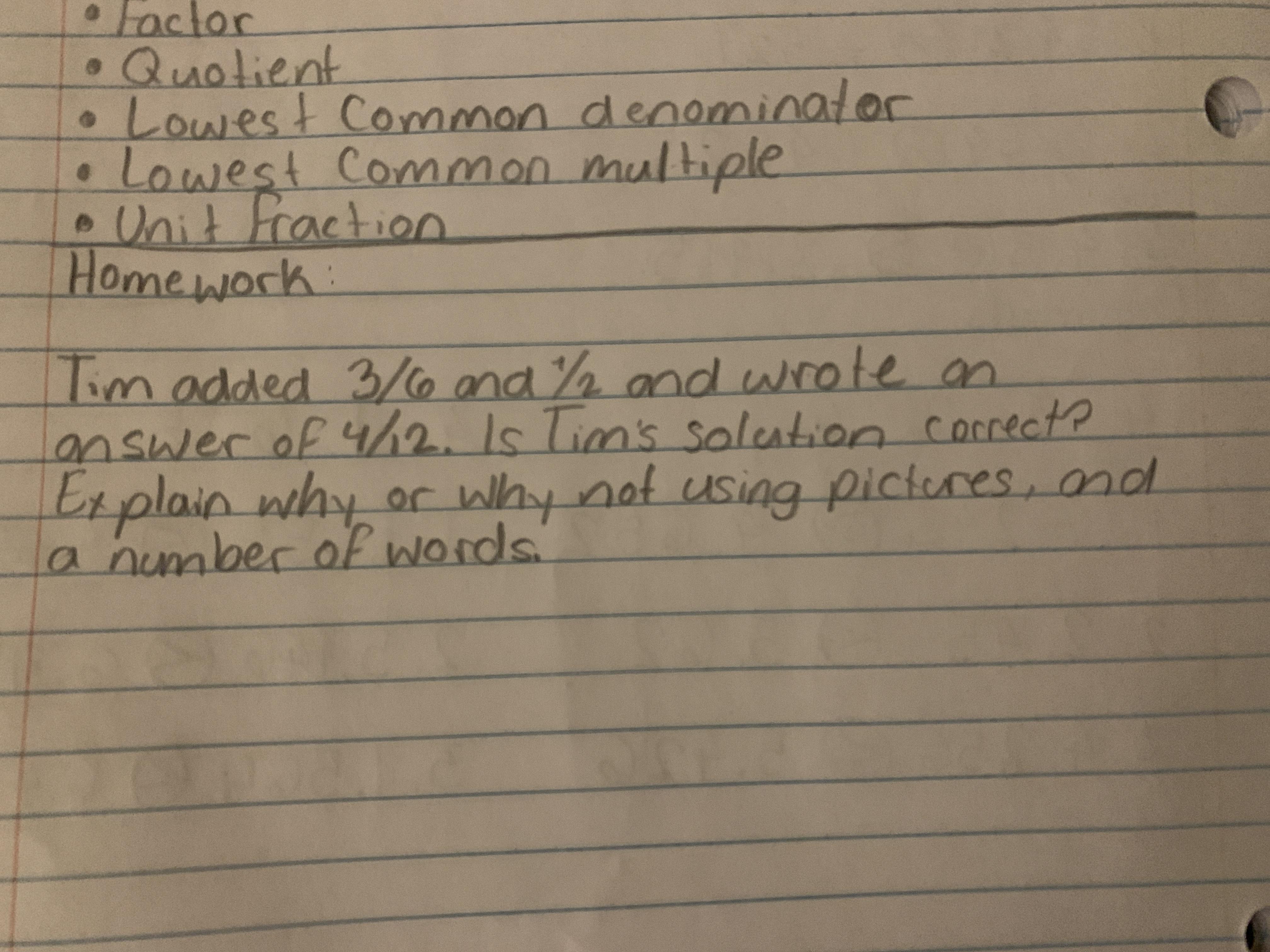Tom is incorrect, it is because 3/6 + 1/2 = 1, 1 does not equal 4/12 or 1/3. So, it makes it reasonable for the correct answer to be Incorrect