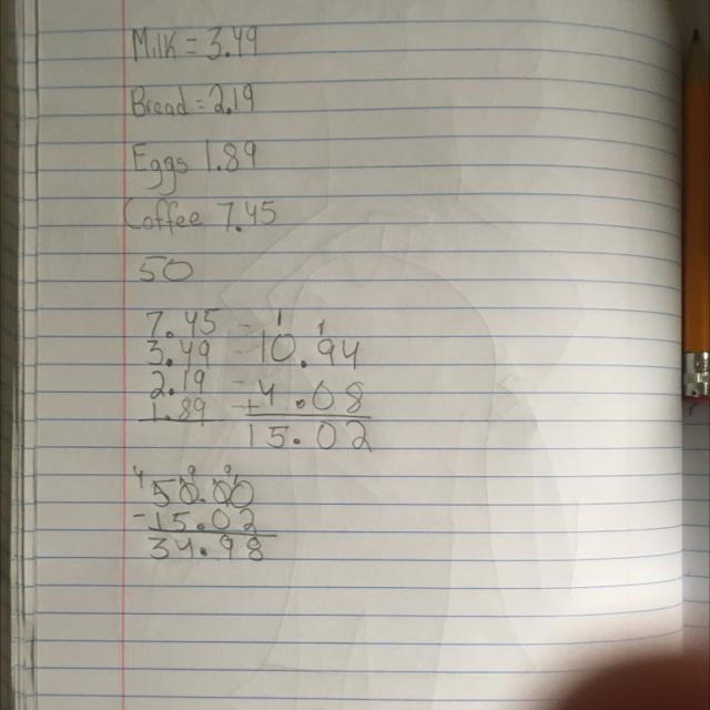 Amy purchased several items at the grocery store: a gallon of milk for $3.49, a loaf of break for $2.19, d.