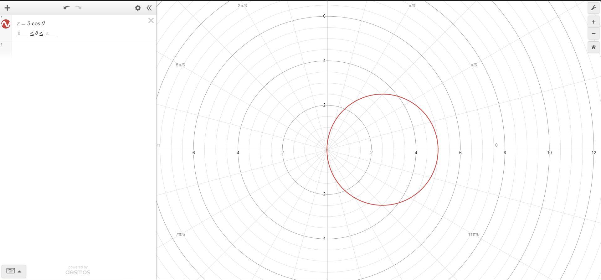 The equation r=5cosθ basically means the graph is going to be a circle with a radius of 5/2=2.5 to the right on the horizontal axis since it's cosine.