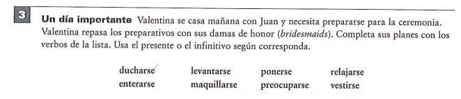<em>¡A ver, chicas! Éstos son los planes para mañana. Presten atención porque no quiero </em><em>preocuparme </em><em>mañana. Quiero estar preparada tres horas antes de la ceremonia. Éste es el plan: todas </em><em>nos levantamos</em><em> temprano, a las siete de la mañana. Yo necesito unos veinte minutos para </em><em>ducharme</em><em>. Luego, </em><em>me relajo</em><em> un rato mientras espero a la peluquera. Después, </em><em>me visto</em><em>; el vestido es tan bonito... ¡Qué nervios! Luego </em><em>me maquillo</em><em> yo sola porque no me gusta que nadie me toque la cara. Seguramente Juan también va a</em><em> ponerse </em><em>muy nervioso, como yo. Pero seguro que los invitados no van a </em><em>enterarse </em><em>de lo nerviosos que estamos.</em>
