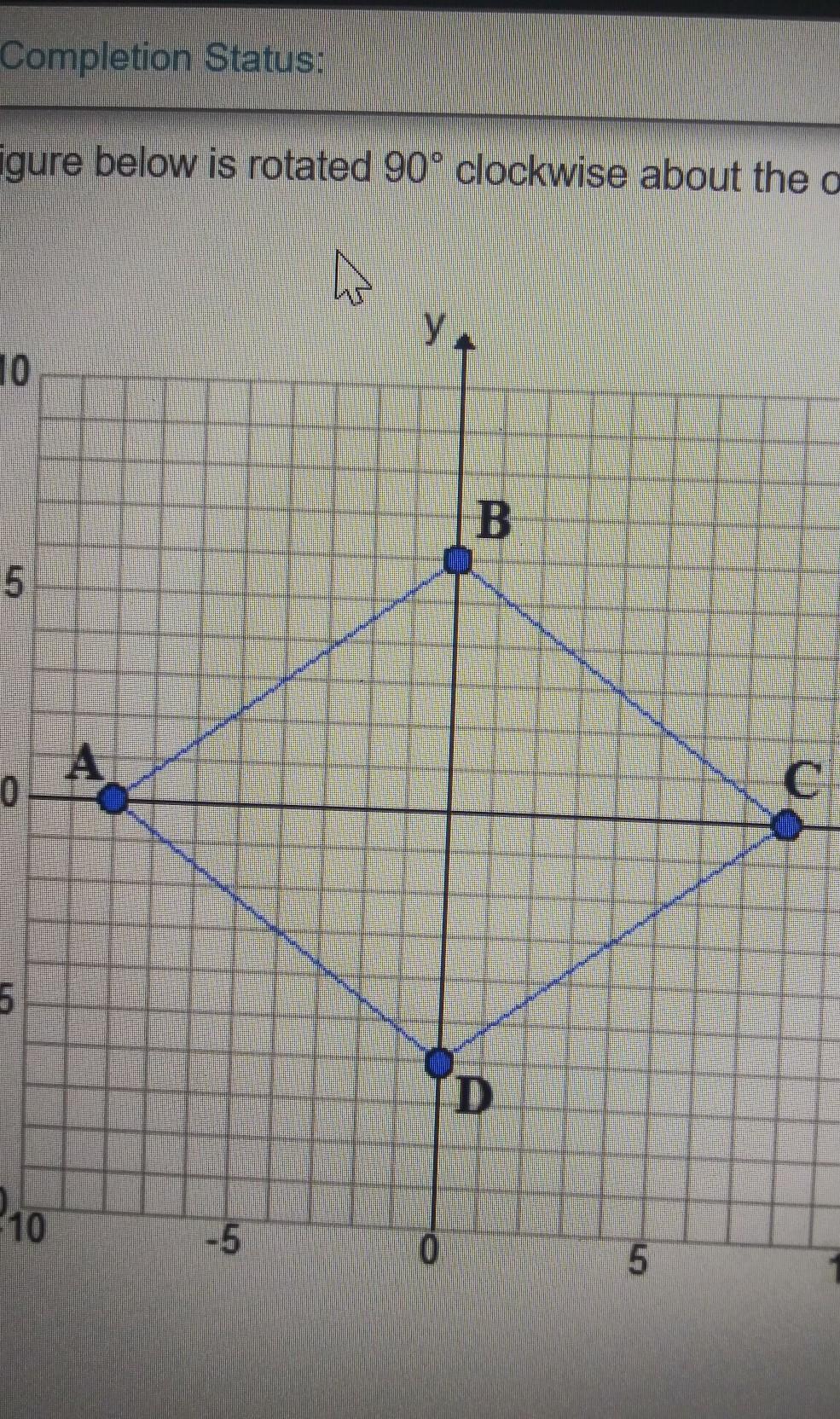Whenever you are doing a 90° clockwise rotation ABOUT THE ORIGIN, it is in the form of [<em>y</em><em>,</em><em> </em><em>-</em><em>x</em>], meaning you take the <em>y</em><em> </em>and make it your <em>x</em><em>,</em><em> </em>then take your original <em>x</em><em> </em>and put its OPPOSITE.