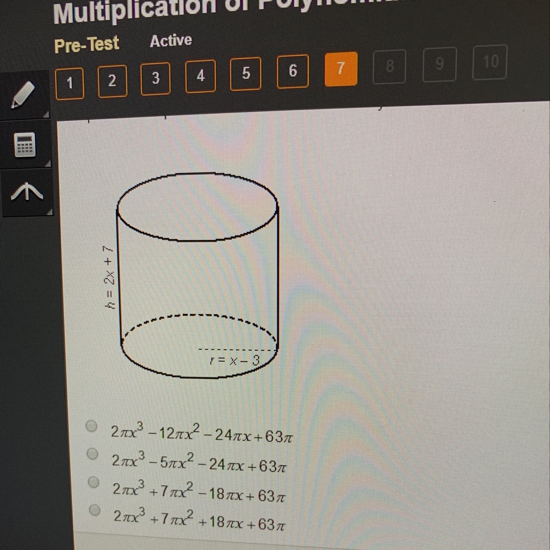 The volume of a cylinder is given by the formula V= pi^2h, where r is the radius of the cylinder and h is the height: which expr