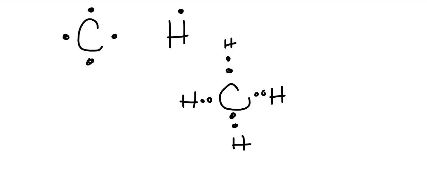 Separately, the Carbon has 4 valence electrons so it gets 4 dots, and the Hydrogen has 1 valence electron, so it gets one dot. Together the carbon forms 4 single bonds with 4 hydrogens and together have 8 dots.