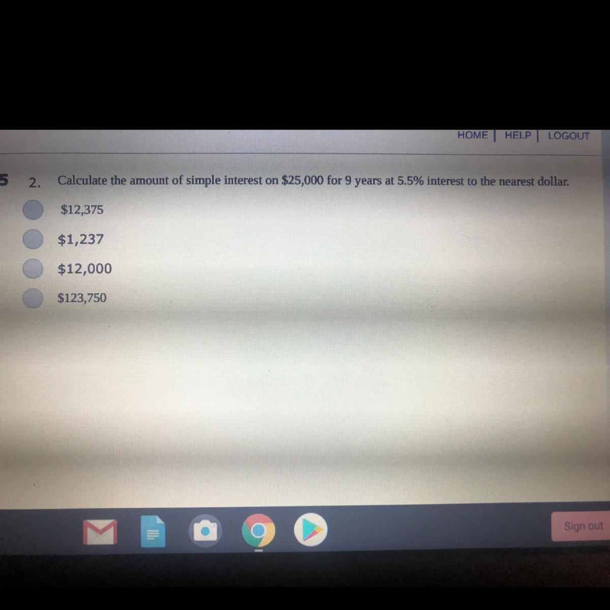 A = 37375 in this case. This is the amount of money you'll have after 9 years. However, the question asks for how much interest you'll gain, meaning you have to subtract the principle from it. 37375 - 25000 = 12375