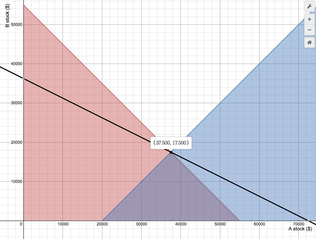 Natsano can satisfy his constraints by investing the first $20,000 in Company A, then splitting the remaining $35,000 evenly between the companies. For best return, he needs to invest as much as possible in Company B, but each such dollar (after the first 20k) must be matched by a dollar invested in Company A. That is, his investments should be ...