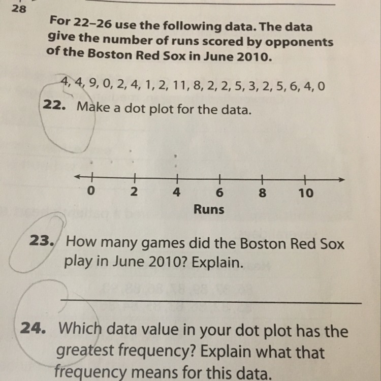 (#22) Ok first, before we answer anything, let's get organized. All the numbers are out of order and can be very confusing, so lets put them in ascending(rising) order from 0 to 11. That would result in: 0, 0, 1, 2, 2, 2, 2, 2, 3, 4, 4, 4, 4, 5, 5, 6, 8, 9, 11. Now that its in order, its easier to see how many dots to put on top of each number. You would put two on top of 0, one on top of 1, five on top of 2, and so on.
