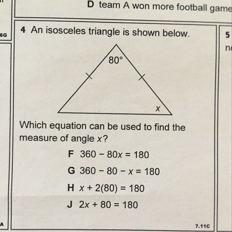 I would say the answer is J because follow the traingle sum theorem, all angles add to 180. There are 2x and you know that one is 80. Hope this helped! :)
