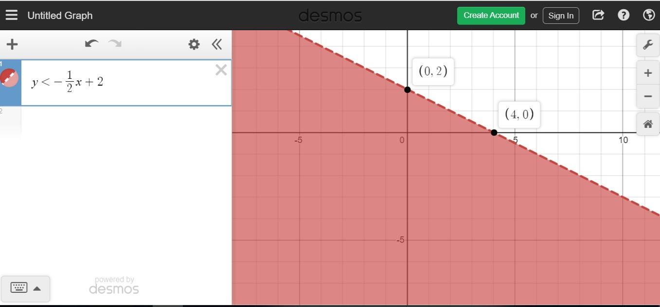 The solution of the inequality is the shaded area below the dashed line