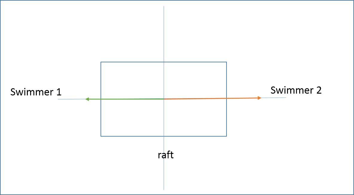 Comparing both forces, and taking into account each swimmer has a horizontal velocity of , we can deduce the raft will move in the direction of the greatest force, which is where swimmer 2 is (to the right).