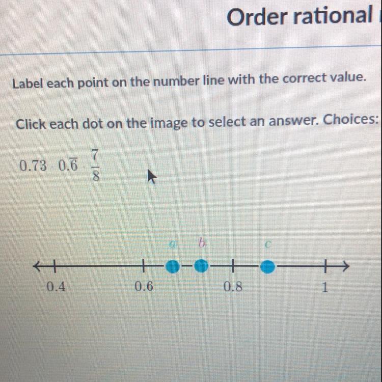 The first two numbers, 0.73 and 0.667, are near the point that is halfway between 0.6 and 0.8. That halfway point is 0.7. The value 0.667 will be below (left) of the halfway point, so is point <em>a</em>. The value 0.73 will be above (right) of the halfway point, so is point <em>b</em>. The remaining value, 7/8, must be point <em>c</em>.