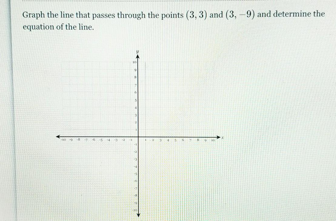 Graph the line that passes through the points (3, 3) and (3,-9) and determine the equation of the line.(i can use just the point