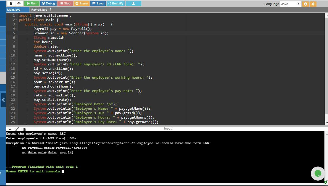 throw new IllegalArgumentException("An employee id should have the form LNN.");        }        //throws exception
