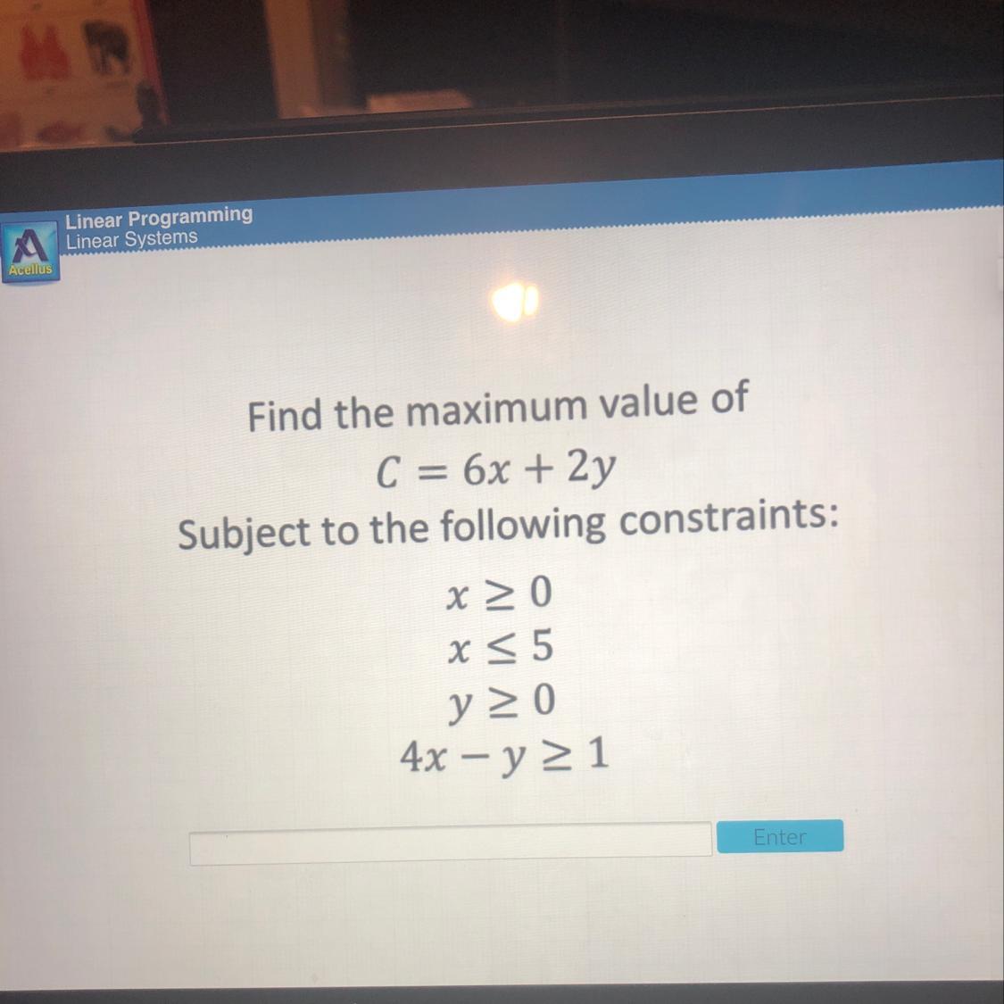 We see that C grows bigger, as x and y grows bigger. So we want x to be as large as possible. But by the second constraint, x can at most be 5. So we choose