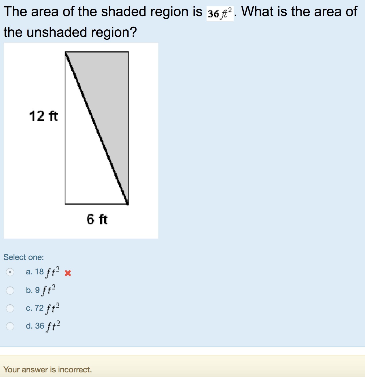 ∵ Area of rectangle is L ⋅ W = 12 ⋅ 6 = 72