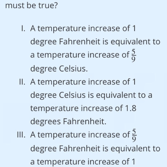 III. Since a temperature increase of 1 degree Fahrenheit is equivalent to a temperature increase of