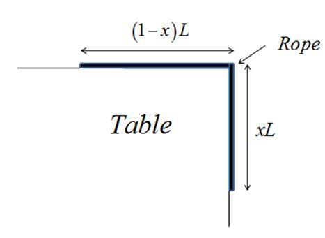 The rope, of uniform mass, is hanging over the edge of the table. The rope is hanging without sliding.