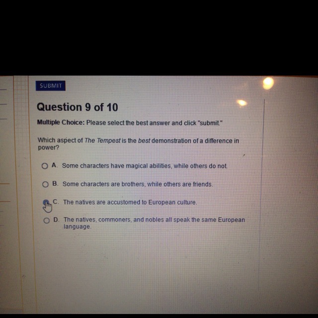 The best demonstration of a difference in power in The Tempest is that some characters have magical abilities while others do not.