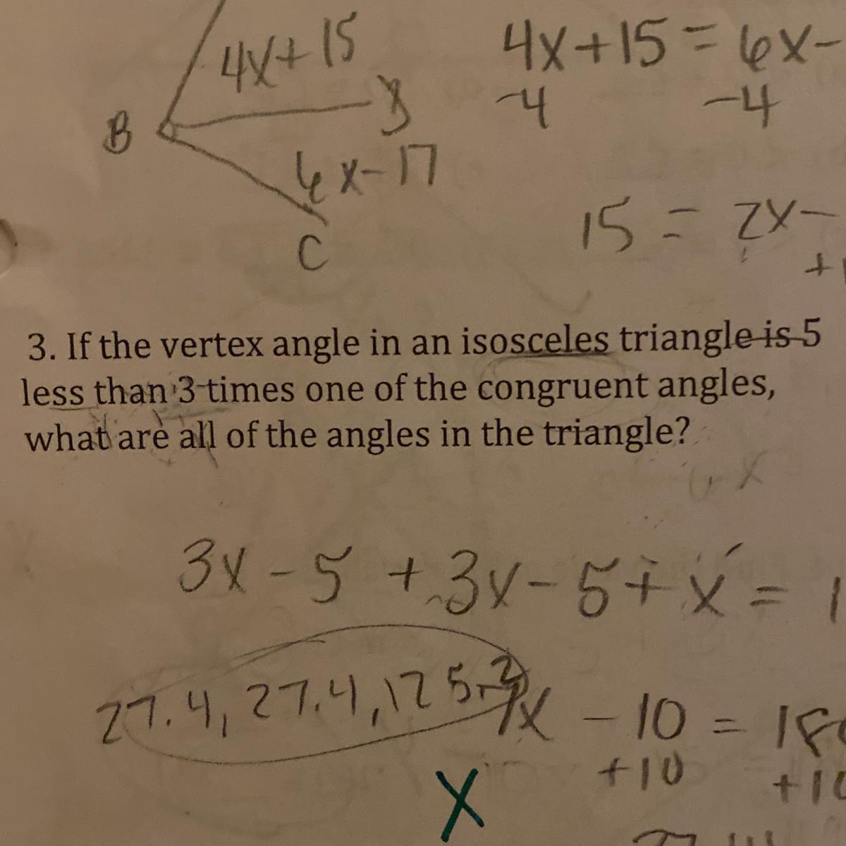 Vertex Angle is 5 less than 3 times one of the base angles, we can write: