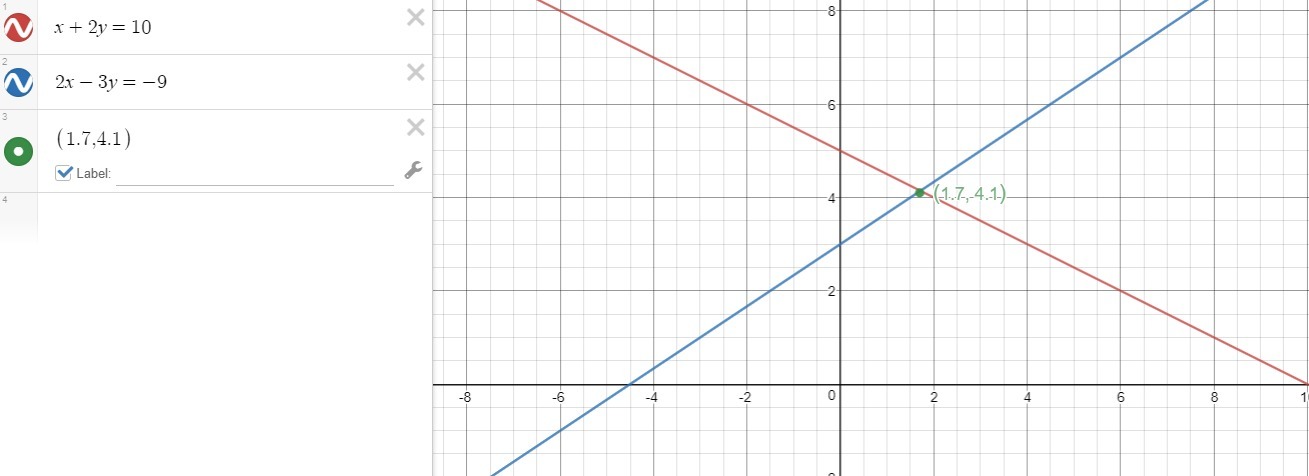 Remember that the point of intersection of two lines is the solution of the system of linear equations. We know from our graph that our lines intersect at the point (1.7, 4.1), so the solution of our system of linear equations is (1.7, 4.1).