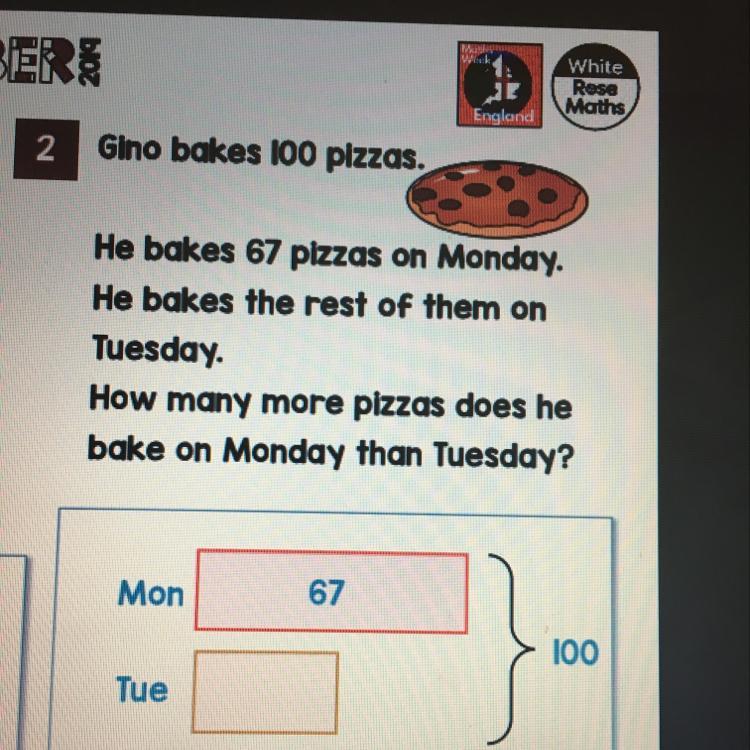 Gino Bakes 34 more pizzas on Monday than Tuesday.