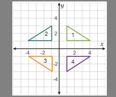 On a coordinate plane, triangle 1 is reflected across the x-axis to form triangle 4, is reflected across a diagonal to form tria