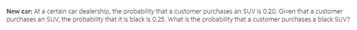 "At a certain car dealership, the probability that a customer purchases an SUV is 0.20. Given that a customer purchases an SUV, the probability that it is black is 0.25."