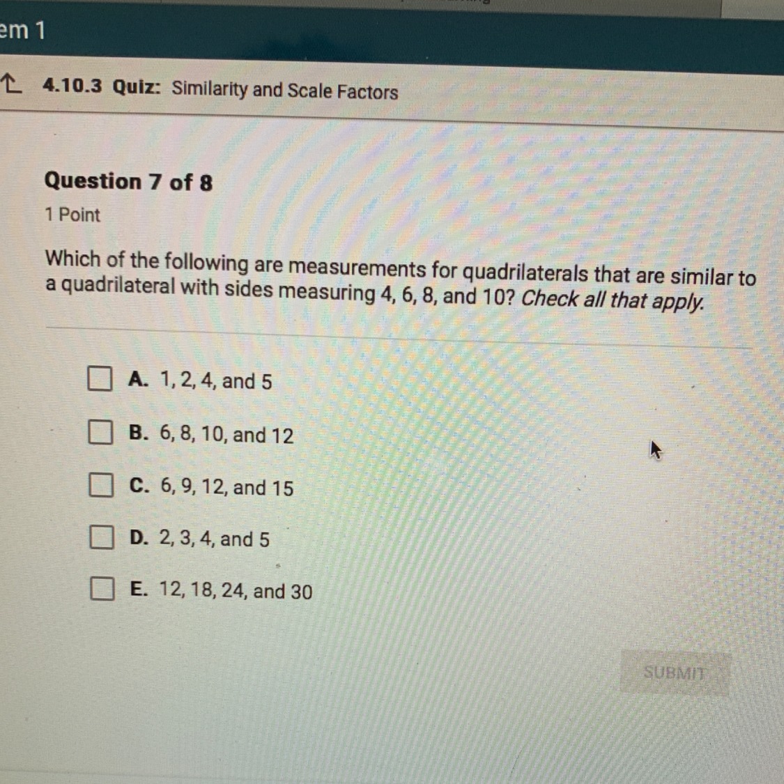 We can see that one side in not proportional to its corresponding, whether other sides are proportional. Therefore, the measurements given in option A are not of a similar quadrilateral to our given quadrilateral with sides measuring 4,6,8 and 10.
