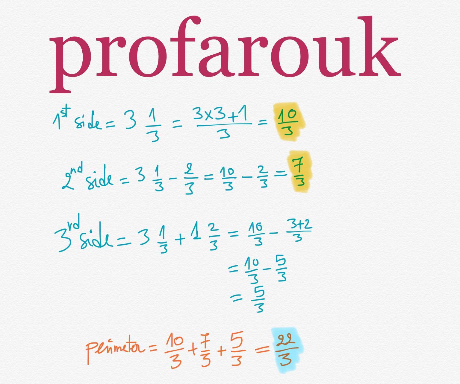 One side of a triangle is 3 1/3 cm, another side is 2/3 cm shorter than the first side, and the third side is 1 2/3 cm longer th